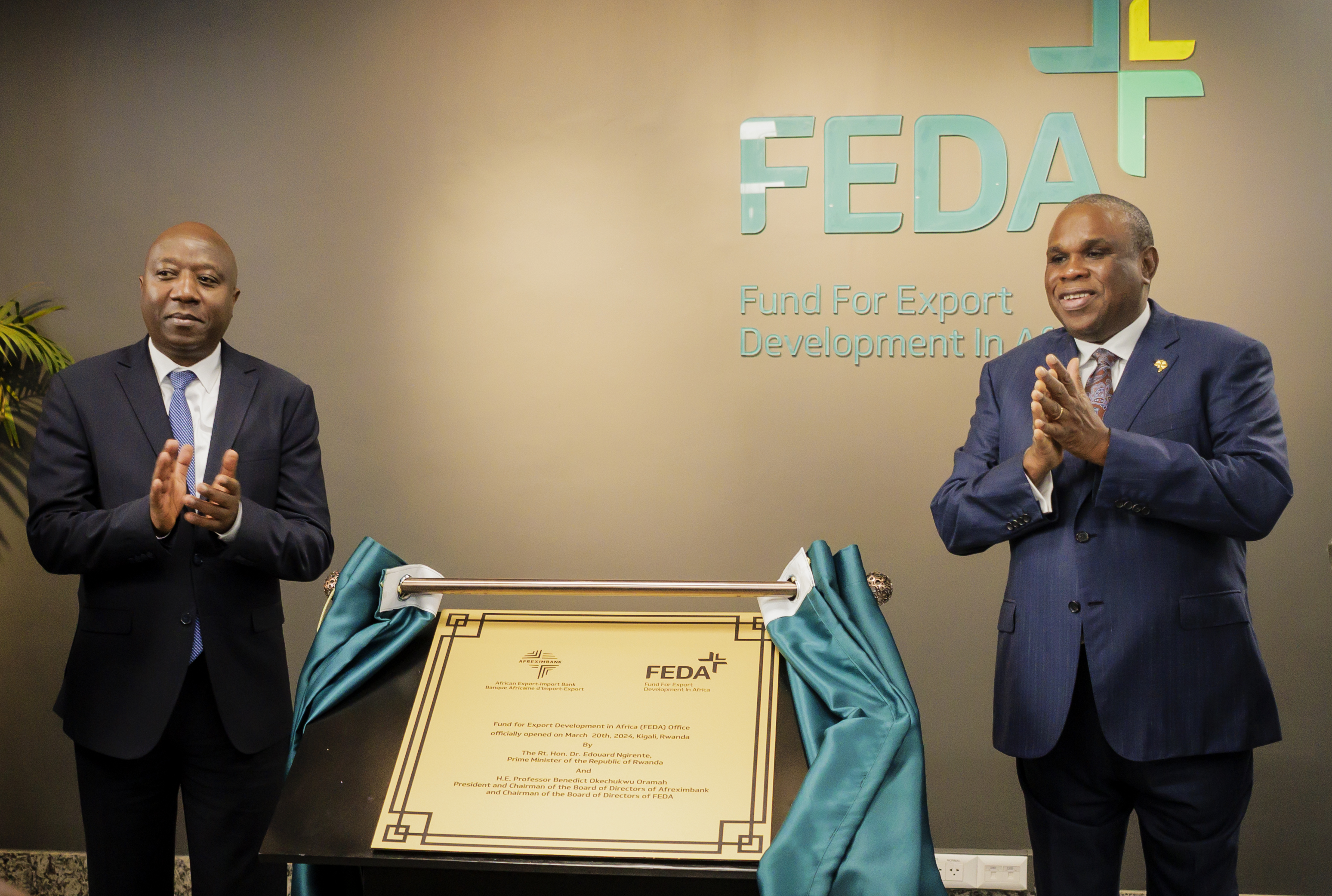 Right Honourable Dr. Edouard Ngirente, the Prime Minister of the Republic of Rwanda (left) and President and Chairman of the Board of Directors of Afreximbank, Prof. Benedict Oramah applaud after the Premier officially inaugurated the Fund For Export Development in Africa (FEDA) offices in Kigali, Rwanda. They were accompanied by Chief Executive Officer of FEDA, Marlene Ngoyi (left), the Executive Vice Presidents of Afreximbank and members of the Board of Directors of FEDA at the event