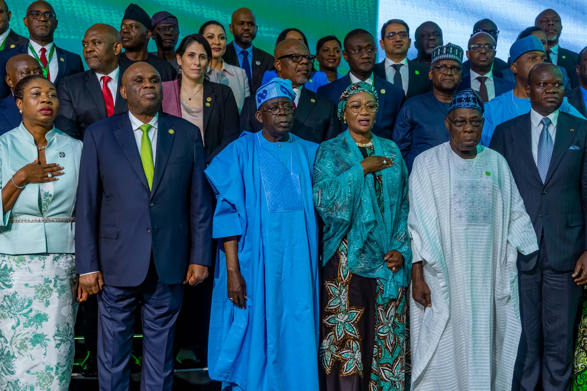 Front row (L-R): Mrs Chinelo Oramah, Matron of Afreximbank Spouse Network (ASNET), Professor Benedict Oramah, President and Chairman of the Board of Directors of Afreximbank, H.E Bola Ahmed Tinubu (GCFR), President of the Federal Republic of Nigeria, H.E Senator Mrs Oluremi Tinubu (CON), the First Lady of Nigeria, H.E. Olusegun Obasanjo, Former President of Nigeria, and H.E. Brice Oligui Nguema, President of the Republic of Gabon
